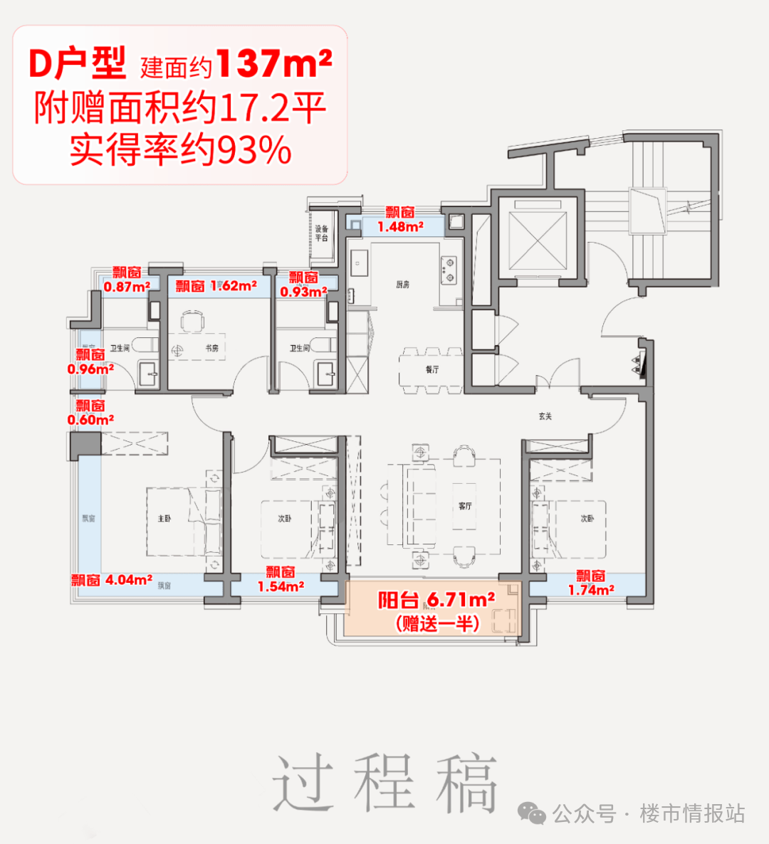 该户型满配6飘窗,比常规户型多2个卫生间飘窗、1个厨房飘窗;再加上阳台送一半面积,经过测算总赠送约9.3平,相当于一间次卧。