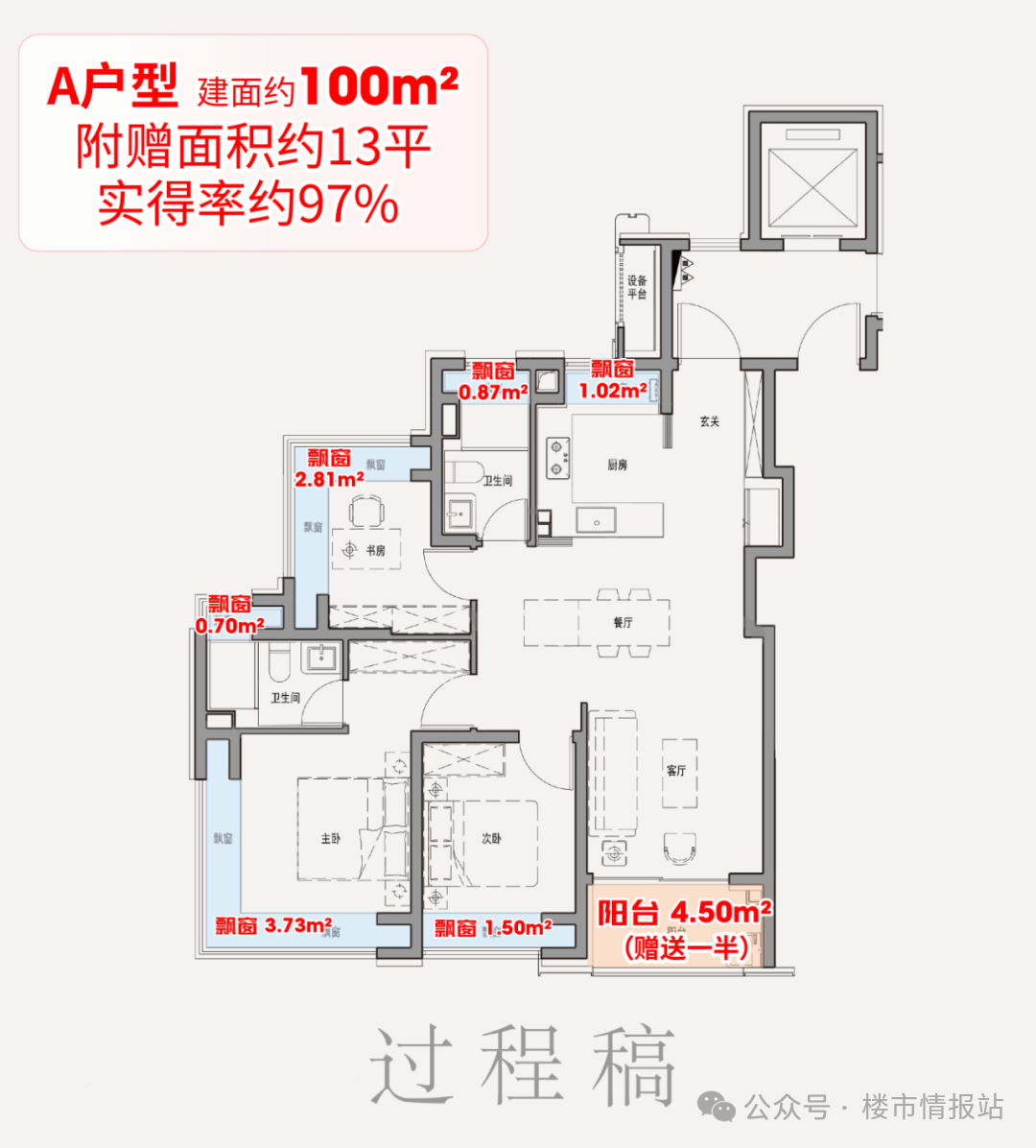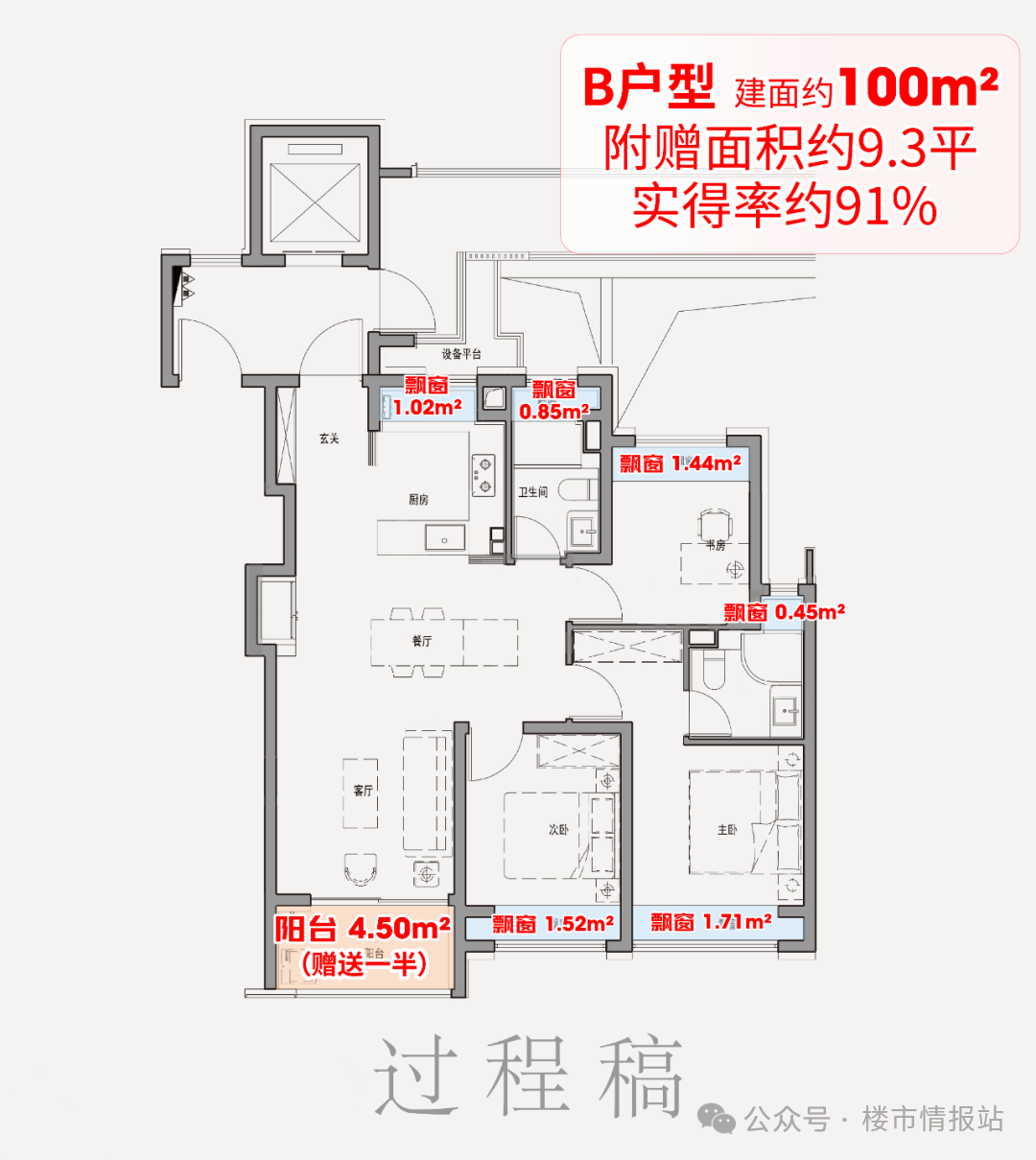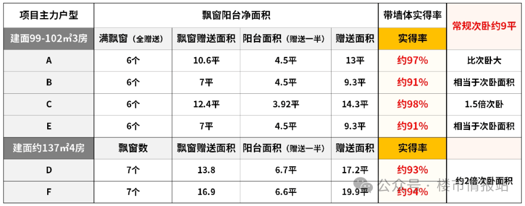 项目全系户型标配“全屋飘窗(全赠送)+大阳台(半赠送)”,经专业测算,百平米中间套实得率约91%,边套更甚,远超市场常规水平: