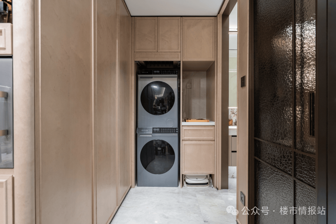 值得一提,该户型还配备专属家政空间,邻卫生间,动线更流畅,洗完澡可以顺手把脏衣服放到洗衣机,更彻底解放阳台,阳台不用晾晒,完全用于观景或志趣空间。