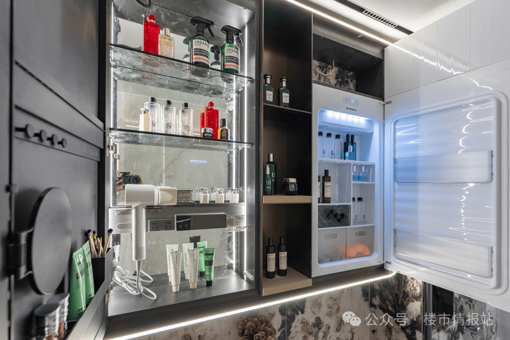 值得一提,保利戳中女性需求,主卫新增科勒美妆龙头,水流角度贴合化妆、护肤需求;主卫镜柜嵌入美妆冰箱,贴心存储口红、面膜等护肤品。1✅✅保利外滩启PARK77售楼处电线✅✅保利外滩启PARK77售楼处电线户型谍照②、审美升级:设计感渗透每一处细节!