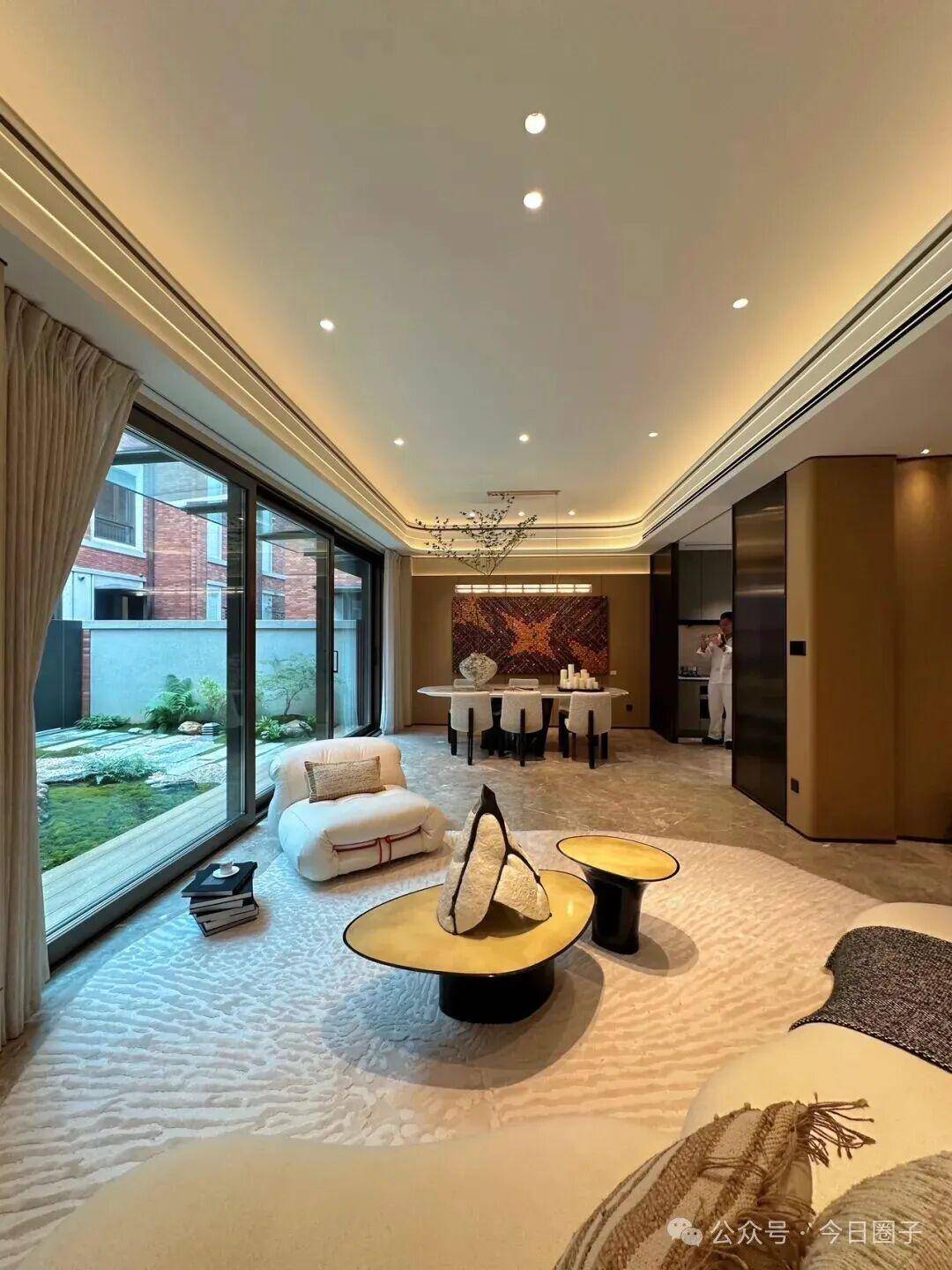 「无界空间」:客厅270度转角无柱设计,搭配落地玻璃,开阔视野将院中风景迎入日常。
