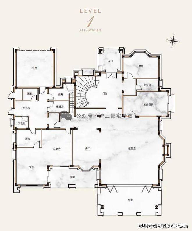 外立面:采用保加利亚维纳多天然石材,搭配手工雕花铜艺与 270° 全景飘窗,斜坡屋顶配弧形老虎窗。