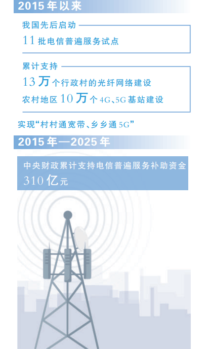 为让农村及偏远地区居民公平使用通信设施及其服务,共享数字红利,我国创建了“中央资金引导、地方协调支持、企业主体推进”的电信普遍服务补偿机制。2015年—2025年,中央财政累计支持电信普遍服务补助资金310亿元,极大调动了基础电信企业的积极性,形成了中央、地方、企业合力支持农村宽带建设的良性互动发展格局。