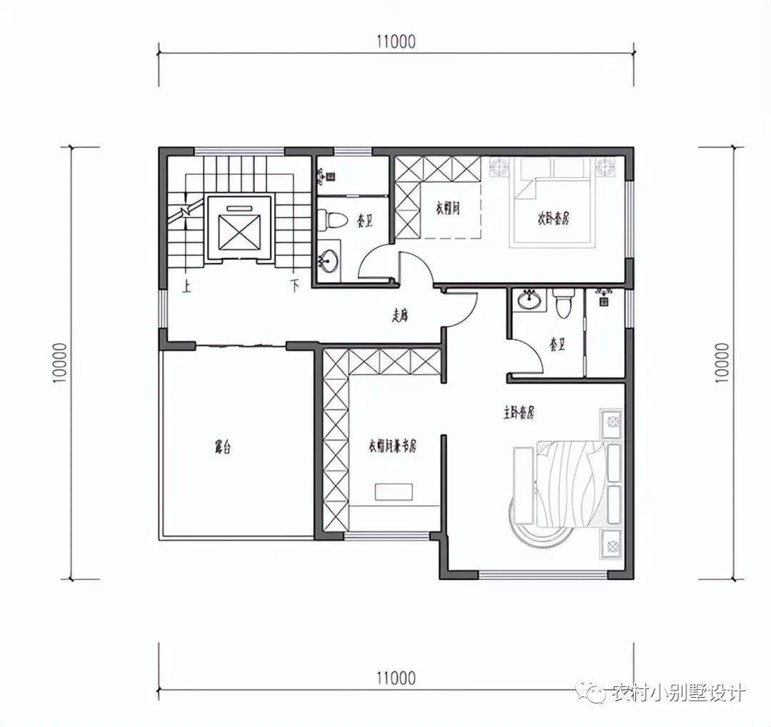 二层主要为居住区:设置有一个主卧套房,带有衣帽间和独立卫生间,另外设置有两个次卧套房,面积上稍微小一点,但是都有自己的独立卫生间,北面的次卧套房还有衣帽间