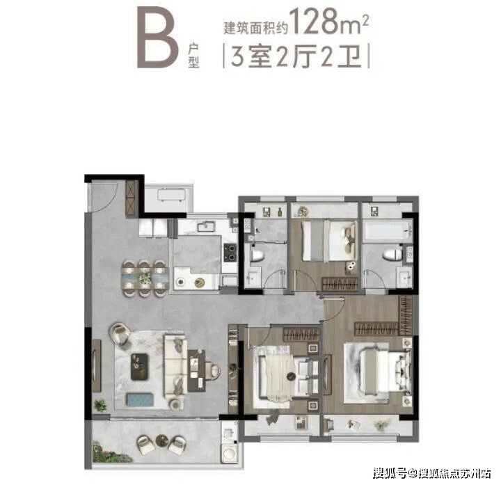 128㎡三室两厅两卫:升级为横厅布局,客厅面宽达4.2米,连接约6米观景阳台。主卧配备独立衣帽间和明卫,次卧可改造为书房,总价约339万,改善家庭首选