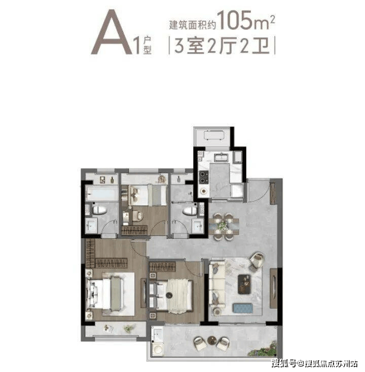105㎡三室两厅两卫:经典竖厅设计,南向双卧+客厅三开间朝南,U型厨房连接生活阳台,总价约278万起。该户型动静分区明确,主卧套房设计,适合年轻三口之家